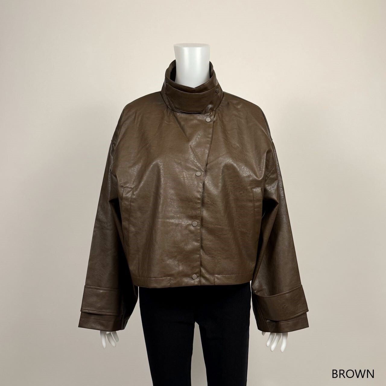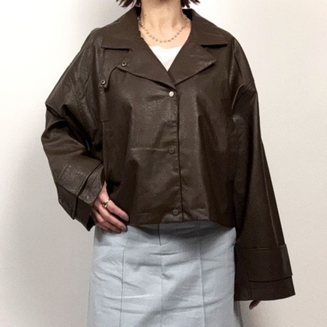高品質なフェイクレザー素材を使用し、スタイリッシュかつ軽量な着心地を実現したブルゾン。ライダースライクなデザインがコーディネートにエッジを効かせ、スタイリッシュフェミニンなスタイルを完成させます。