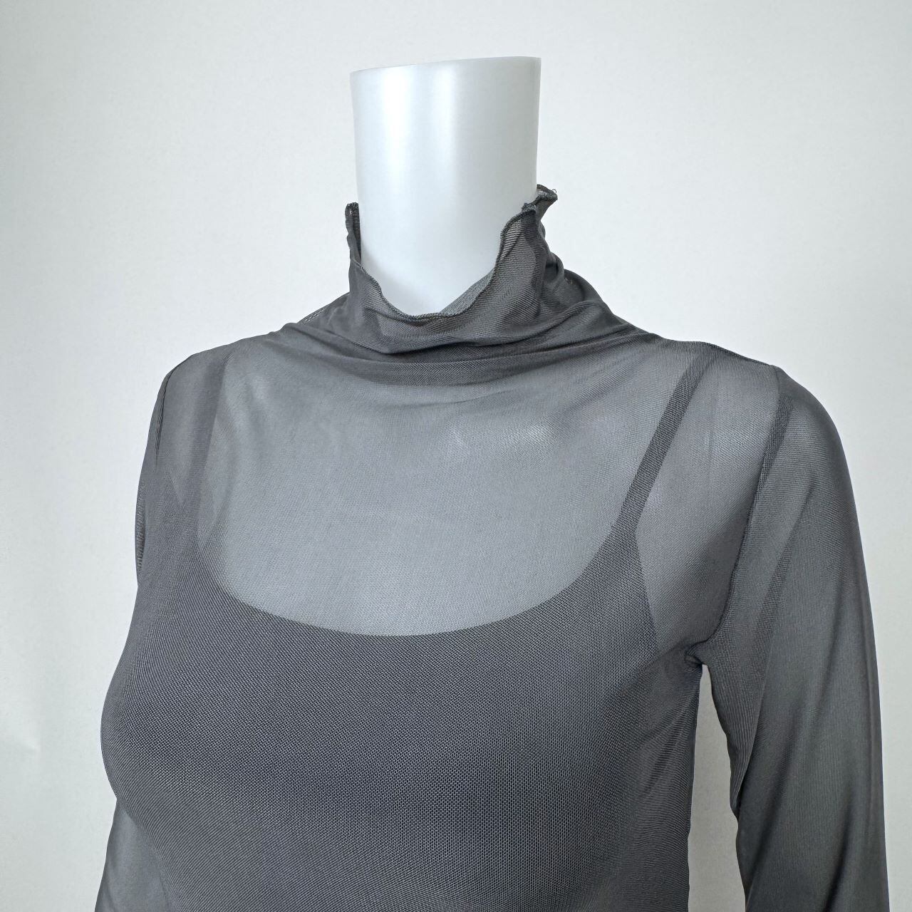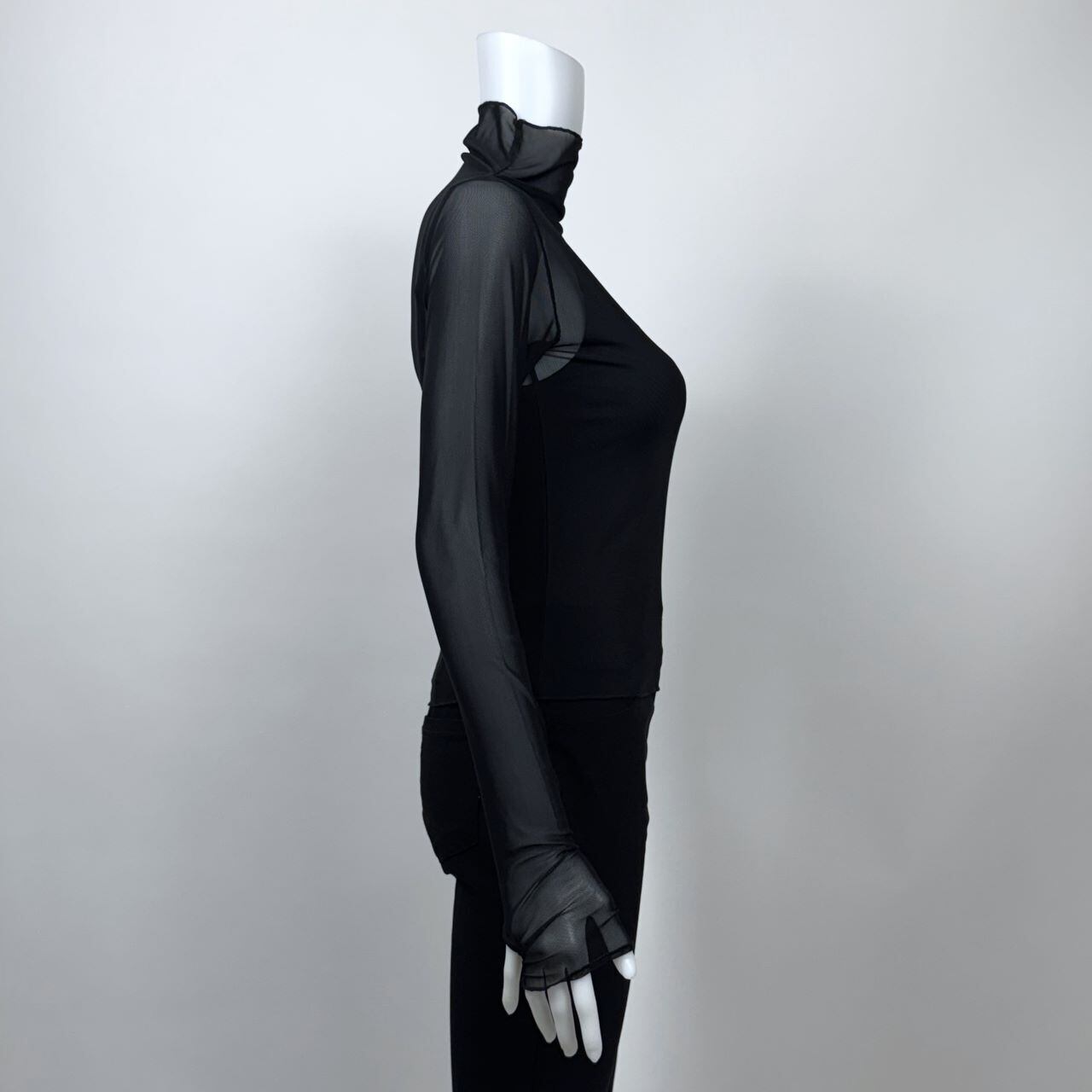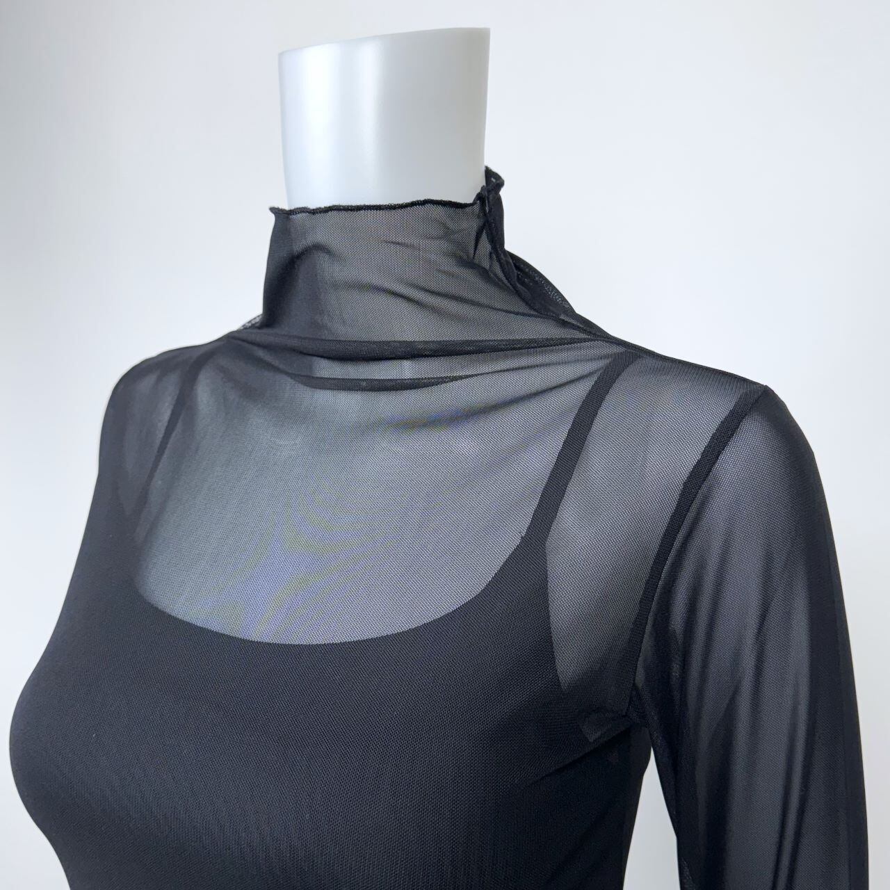 フィットしすぎないサイズ感がボディラインを美しく見せる、シアーなハイネックプルオーバー。
